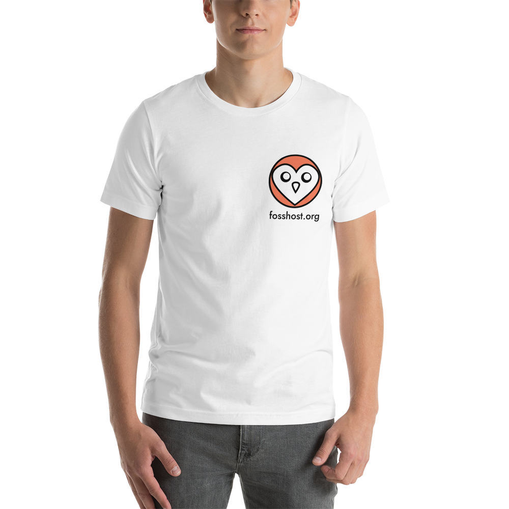 Unisex short sleeve tshirt featuring a digital printed Fosshost OWL with fosshost.org text directly below. This item includes free promotional delivery for a limited time only to celebrate the launch of the Fosshost Merchandise store.